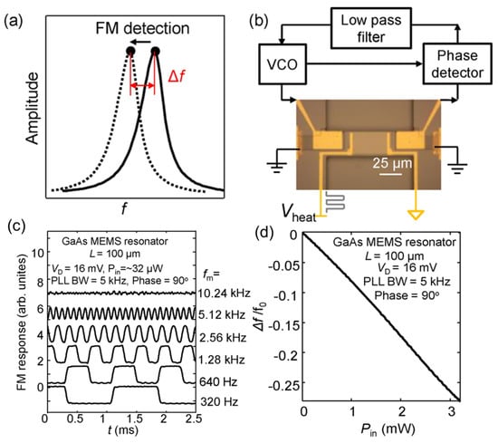 (a) Schematic diagram of the FM detection. Reprinted from [59], with the permission of AIP Publishing. (b) Circuit illustration of the FM detection. The MEMS beam resonator achieves a self-sustained oscillation mode with a PLL. The modulated voltages with various modulation frequencies fm are applied to the NiCr heater. Reprinted from [59], with the permission of AIP Publishing. (c) The Signal waveforms in the case of being switched on and off at fm = 320–10,240 Hz, with the initial conditions: VD = 16 mV, Pin = 32 µW, and the demodulation bandwidth of the PLL is 5 kHz. Reprinted from [59], with the permission of AIP Publishing. (d) The normalized measured frequency shift as a function of Pin, using the FM detection mode. Reprinted from [59], with the permission of AIP Publishing.
