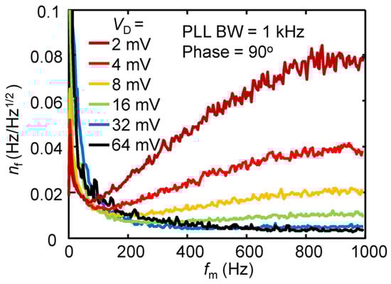 The measured frequency noise, nf, as a function of the heat modulation frequency, fm, at various driving voltages (VD = 2, 4, 8, 16, 32, and 64 mV). The demodulation bandwidth of the PLL is set to be 1 kHz. Reprinted from [59], with the permission of AIP Publishing.