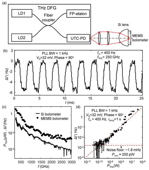 (a) A schematic diagram for the optical measurements that use a monochromatic THz DFG source. LD1 and LD2 are two tunable lasers that have a lasting frequency difference in the THz range. A uni-traveling-carrier photodiode (UTC-PD) is used to generate THz radiation by using the mixed output of LD1 and LD2. The MEMS resonator is mounted on a silicon hyper-hemispherical lens to focus the incident THz radiation on the MEMS beam. Reprinted from [59], with the permission of AIP Publishing. (b) The detected frequency shift of the MEMS bolometer when the output THz power of the DFG source is switched on and off. The output frequency of the THz DFG, fTHz, is set to be 250 GHz. The THz radiation is modulated at 400 Hz. The output power, PTHz, is 0.44 μW. The MEMS resonator was operated in FM detection mode with a PLL demodulation bandwidth of 1 kHz. Reprinted from [59], with the permission of AIP Publishing. (c) THz power measured by a Si composite bolometer as the THz DFG frequency is scanned from 250 GHz to 3.0 THz. The THz output power decreases from 0.44 μW to 80 pW as the DFG frequency increases. The dots show the measured frequency shift, Δf, of the MEMS bolometer. Δf is measured by using a lock-in time constant, τamp, of 1 s at 300 K. Reprinted from [59], with the permission of AIP Publishing. (d) Output signal of the MEMS bolometer, Δf, as a function of PTHz. The noise floor of the present MEMS bolometer is ~1.8 mHz. Using this value, the minimum detectable power, Pmin, is determined to be ~200 pW. Reprinted from [59], with the permission of AIP Publishing.