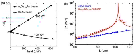 (a) The normalized frequency shifts are plotted as a function of the input heating power for the GaAs beam (open circles) and the InxGa1−xAs beam (full circles). Reprinted from [88], with the permission of AIP Publishing. (b) The absolute value of the thermal responsivities of the In0.004Ga0.996As and GaAs beams is plotted as a function of the beam length. Dots: experiment; line: theory. The In0.004Ga0.996As beams longer than 105 μm are buckled, and the polarity of their responsivities is inverted (red triangles). Reprinted from [107], with the permission of AIP Publishing.