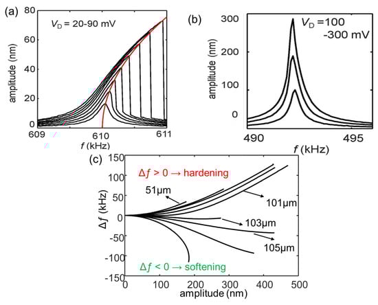 In Section 3.1, we have mentioned that noise is a crucial factor in determining the sensitivity of MEMS bolometers, which can be greatly suppressed by applying a large driving voltage to achieve a large oscillation amplitude [90,99]. In sensing applications with MEMS bolometers, a large linear oscillation amplitude is preferable to reduce the frequency noise and improve the SNR. However, with increasing oscillation amplitude, the MEMS resonators commonly enter the nonlinear oscillation region because of the mechanical nonlinearity, where hysteretic oscillations and increased frequency noise have been observed [114,115]. This limits the potential for achieving large linear amplitudes by increasing the driving voltage. The control of mechanical nonlinearity is therefore desirable for achieving low-noise operation of MEMS resonators.
