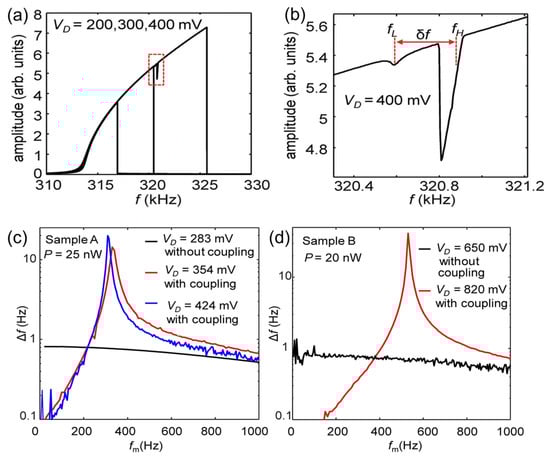 (a) The measured resonance spectra at VD = 200, 300, and 400 mV. Reprinted with permission from [110]. Copyright 2020 American Physical Society. (b) A blow-up of the spectrum in the mode-coupling region marked by a dotted rectangle in (a). Reprinted with permission from [110]. Copyright 2020 American Physical Society. (c) Thermally induced frequency shift, Δf, for sample A as a function of heat modulation frequency, fm, measured at p = 25 nW. The black, blue, and red curves plot the results when VD = 283, 354, and 424 mV, respectively. Reprinted with permission from [110]. Copyright 2020 American Physical Society. (d) Thermally induced frequency shift, Δf, for sample B as a function of heat modulation frequency, fm, measured at p = 20 nW. The black and red curves plot the results when VD = 650 and 820 mV, respectively. Reprinted with permission from [110]. Copyright 2020 American Physical Society.