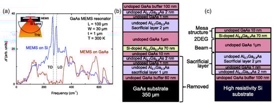 (a) Output Δf-spectra of the MEMS bolometers fabricated on a high-resistivity Si substrate (blue) and on a GaAs substrate (red). Vertical dashed lines indicate the TO and LO frequencies in GaAs. The inset shows a schematic illustration of a MEMS bolometer mounted on a Si lens. Reprinted from [113], with the permission of AIP Publishing. (b) The wafer structure grown for the wafer bonding process. Reprinted from [113], with the permission of AIP Publishing. (c) Wafer-bonded structure used to fabricate the GaAs-based MEMS THz bolometer on a Si substrate. Reprinted from [113], with the permission of AIP Publishing.