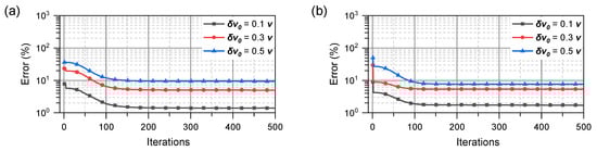 Although the KF is an optimal estimation method when the various errors mentioned above follow a Gaussian distribution, there may be divergence or distortion due to errors or initial values [27] in the linearization of the nonlinear models. In addition, in this study, the number of observations is limited; we believe that the prior knowledge of the velocity vectors is not necessarily accurate. To address these issues, improved algorithms such as the EKF, UKF, and MVEKF have been proposed. However, when applied to the proposed observation model, these methods do not significantly address these problems. Figure 2 illustrates the error of the velocity vector estimation using the EKF and UKF when the initial value deviates from the true value; represents the difference between the initial and true values. In this simulation, it is defined as , where is the initial value, and v is the true value of the velocity vector.