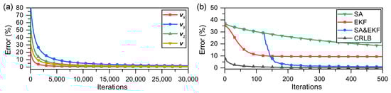 Comparing Figure 3a and Figure 4, it is evident that switching to the EKF after running a GD with the SA mechanism can converge to a lower error faster and more accurately, which in this model corresponds to the estimation of the velocity vector converging to the global optimal solution. It is believed that switching between different criteria can facilitate optimization of the velocity vector quickly and effectively; the SA mechanism ensures that the optimization process converges to a global optimal solution.