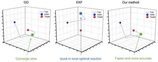 In Scenario 1, the velocity vector v was set to a fixed value; the EKF and GD were used for comparison with the proposed method. The velocity vector value of each iteration was recorded as a coordinate point in space, with the set of coordinates for each method serving as a group of motion trials. This enabled us to visually observe the search paths of the different methods during the iteration process. As shown in Figure 5, during optimization, both the GD and EKF chose completely different trials. This confirms that the two methods can be viewed as optimizations with different criteria. Although the proposed method can be considered to be weighting, it exhibits a different optimization process. The EKF does not converge to the global optimal solution, which we believe is caused by the low dimensions of observational information. The GD converges to the global optimal solution, but the trial is smooth, indicating that it is a slow process. The optimization process of the proposed method inherits the advantages of both methods and can converge to the globally optimal solution (true value) faster and more directly.