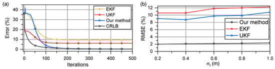 The root mean square error (RMSE) of the estimate is shown in Figure 6b with increasing . This error serves as an indicator of the accuracy of the estimator and the iteration stability of the algorithm. In Figure 6b, as increases, the RMSE of all methods begins to increase; the UKF always performs better than the EKF, which we believe is attributable to the resampling of the unscented transform. The proposed methods have significantly higher estimation accuracies as shown in Figure 6a; they converge more closely to the CRLB.
