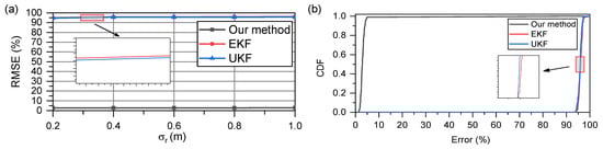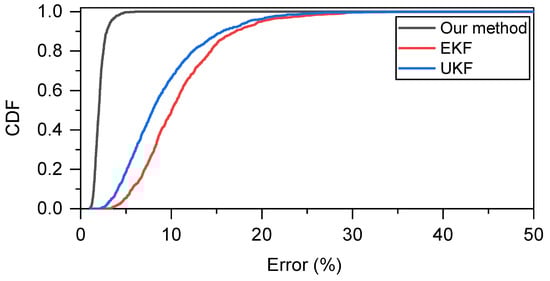 Figure 8a,b show the RMSE and CDF, respectively, when the acceleration remained constant at 2.5 m/s. The model errors were fatal to both the EKF and UKF; their results are extremely poor. In contrast, with the SE optimization strategy, our method can accurately track the real-time speed and converge to a stable error level similar to that in a uniform motion model. This indicates that our method has a higher estimation accuracy and is extremely robust, owing to the heuristic nature of the SE optimization strategy.