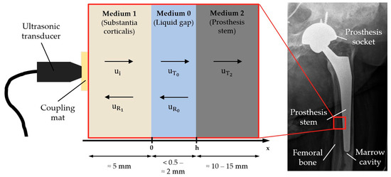 From a physical perspective, the bone–implant interface to be investigated by ultrasound can be represented by an idealized three-layer system (see Figure 1): on the outside lies the solid substantia corticalis, the cortical bone, followed by a thin liquid demineralized substance as the cleavage medium with thickness h, and finally the prosthesis stem, which is again solid.