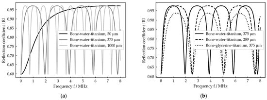 At two idealized test systems, a planar bone–water–titanium setup and a cylindric aluminum–water–aluminum setup, thickness determination was possible within a range of 200 µm ≤ ≤ 2000 µm and 150 µm ≤ ≤ 600 µm, respectively. Among all measurements, there was good agreement between the adjusted and computed interlayer thicknesses. Moreover, the theoretical and experimental reflection spectra showed good agreement too, so the theoretical model combined with our data processing approach generally simulates the real reflection process very well.