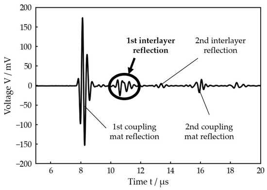 Voltage signal received by the ultrasonic transducer after transmitting a single pulse (planar bone-water–titanium system with calculated interlayer thickness of 221 µm). The first reflection at the interlayer, which is used for the further data processing, is highlighted.