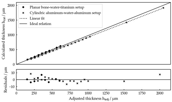 Interlayer thicknesses determined by the algorithm for both idealized test systems for each thickness set by the linear stages and residuals of the linear fits. The linear fits gave for the planar bone–water–titanium system and for the cylindric aluminum–water–aluminum system.