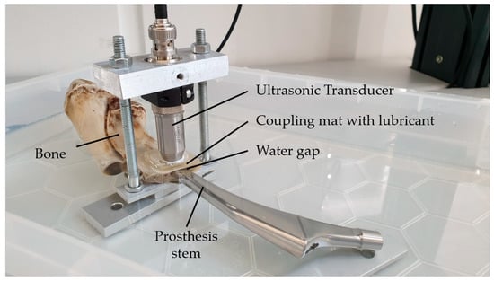 First a planar bone–water–titanium system (Figure 6a) was used as a configuration with ideal geometric surfaces, but with realistic materials and thicknesses of the layers (see Figure 1). A 4 mm thick plate of leaned and bleached water buffalo bone was used as well as a 6 mm thick plate of a TiAl6V4 alloy, which is frequently used for cement-free hip prosthesis stems [1,31].