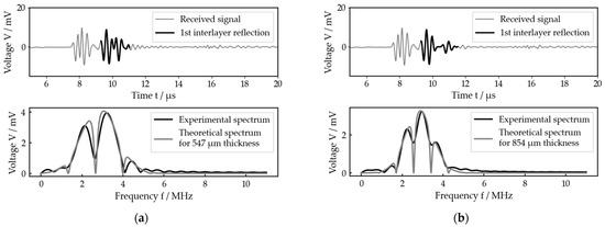 With respect to thickness determination (assuming known material parameters), the approach was successfully validated at two idealized test systems in the range of about 200 µm to 2 mm. Finally, the technique was applied to a bone–implant system, where the algorithm was able to determine interlayer thicknesses in a range of about 200 µm to 1.6 mm and was shown to also be applicable for inhomogeneous, porous materials with rough surfaces as they occur in the potential application. Deviations that appeared between adjusted and calculated thicknesses as well as between theoretical and experimental spectra could be generally explained.