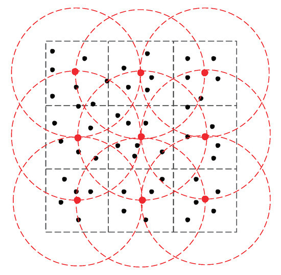 Third, consider three synthetic WSNs, denoted , , and , of sensor nodes that are with a communication radius of 20 m and are placed randomly in a square region of size m2, ; , and have 50 nodes, 100 nodes, and 150 nodes, respectively. For each normal node and any time t, assume follows the Gaussian distribution , where , , and the correlation coefficient of the readings of each adjacent pair of sensors is 0.9. Suppose a set of nine watchdogs with a communication radius of 40 m are deployed regularly in the region. See Figure 3 for the distribution of and nine watchdogs.
