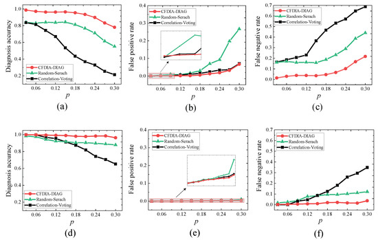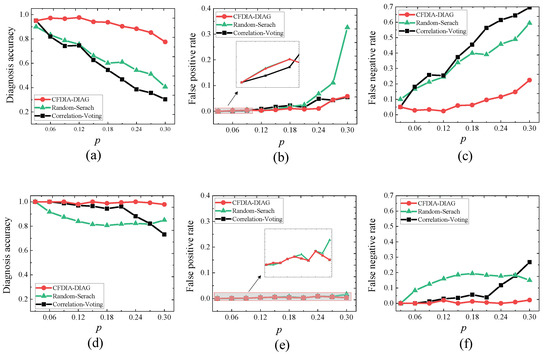 Figure 5. Effectiveness of the CFDIA-DIAG diagnosis algorithms in experiment 2. (a) Diagnosis accuracy in the CFDIA situation. (b) False positive rate in the CFDIA situation. (c) False negative rate in the CFDIA situation. (d) Diagnosis accuracy in the SFDIA situation. (e) False positive rate in the SFDIA situation. (f) False negative rate in the SFDIA situation. - 2.