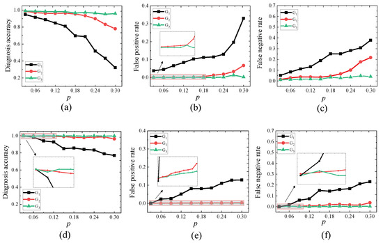 Consider the three WSNs: , , and . Let . Let be a set of abnormal nodes of randomly produced based on p. Let be the syndrome on produced by under the CFDIA that the readings of each of the compromised nodes are enhanced or reduced by 10%; the syndrome on produced by under the SFDIA that the readings of all the compromised are enhanced by 40%.