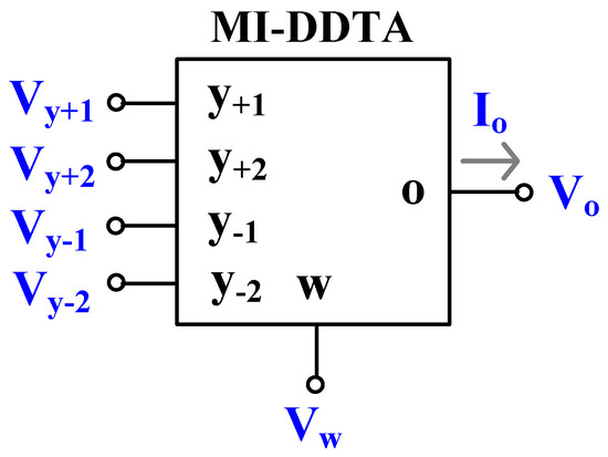 Figure 1 shows the electrical symbol of the DDTA. The y- and o-terminals possess a high impedance level, while the w-terminal possesses a low impedance level. The addition and subtraction voltages at the w-terminal (Vw) are transformed to a current at the o-terminal by the transconductance . The port characteristic of the DDTA can be expressed as: