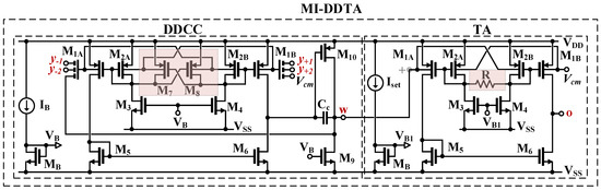 The second-generation current conveyor (CCII) was introduced in [1] as a single active building block, namely containing a voltage follower between the y- and x-terminals and a current follower between the x- and z-terminals. To increase the performance of the CCII for handling differential input signals, a differential difference current conveyor (DDCC) was proposed [2]. A DDCC includes the advantages of both CCII and the differential difference amplifier (DDA) [3] within a single circuit. One such advantage is a high input impedance and arithmetic operation capability, which is valuable for voltage-mode circuits. However, the circuits based on DDCCs lack electronic tuning capability. Thus, the next phase of development of DDCCs has been to obtain electronic tuning capability, for example, as a differential difference current conveyor transconductance amplifier (DDCCTA) [4], differential difference transconductance amplifier (DDTA) [5], or differential voltage current conveyor transconductance amplifier (DVCCTA) [6]. Recently, the DDTA has been designed to operate with a low power supply and low power consumption and has been successfully utilized for various applications with analog filters [7,8,9,10,11,12].