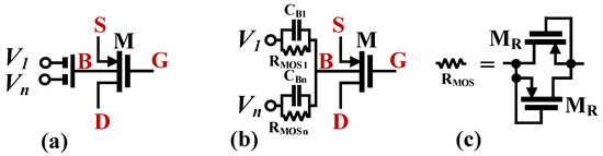 The CMOS structure of the LV LP DDTA was first presented in [10]. The circuit, as shown in Figure 2, consists of two main blocks: a differential-difference current conveyor (DDCC) and a transconductance amplifier (TA). The DDCC can be considered as a two-stage amplifier with a differential difference input stage (M1–M8) and a second stage based on the transistor (M10) operating in a common source configuration. The capacitance CC is used for frequency compensation. The input stage of the DDCC is based on a bulk-driven non-tailed differential pair with partial positive feedback [56,57]. The non-tailed architecture allows operation at very low supply voltages, while providing good common-mode and power supply rejection ratios (CMRR and PSRR, respectively) [56,57]. The BD technique achieves a large common-mode range, which is usually rail-to-rail. In order to improve the voltage gain of the differential amplifier, partial positive feedback (PPF) is introduced by the cross-coupled pair of transistors, M7 and M8. The transistors generate negative conductances, which partially compensate for the total conductances at the gate/drain nodes of M2A and M2B, thus increasing the voltage gain of the whole input stage. The differential difference capability is realized using an MI-BD technique, i.e., using an additional capacitive voltage summing circuit. A particular realization of the MI-BD transistors is shown in Figure 3. The capacitors (CBi) form a voltage divider/voltage summing circuit. In a passband, their impedances are much lower than the resistances of the large resistors (RMOS). The resistors are realized as an anti-parallel connection of two minimum-size MOS transistors operating in a cut-off region (Figure 3c), which are used to provide proper biasing of the bulk terminals of the input MOS transistors for DC. This solution provides differential difference capability without using a second transistor pair, thus saving dissipation power and simplifying the overall structure. The voltage VW can then be expressed as: