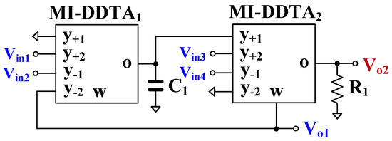 Figure 4 shows the proposed voltage-mode first-order analog filter employing two MI-DDTAs, one grounded capacitor C1 and one grounded resistor, R1. The Vin1, Vin2, Vin3, and Vin4 are the input voltages, while Vo1 and Vo2 are the output voltages. The inputs, Vin1, Vin2, Vin3, and Vin4, are applied via the high-impedance level (y-terminal) of the MI-DDTA, while the output Vo1 is available at the low-impedance level (w-terminal) of the MI-DDTA. Thus, the proposed filter possesses high-input and low-output impedances.