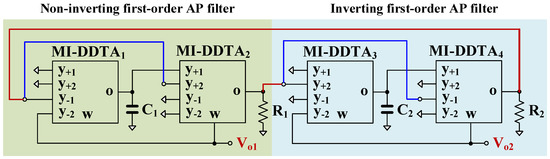 First-order filters are single-pole circuits that are widely used in signal processing. There are three filtering functions to realize first-order transfer functions: low-pass (LP), high-pass (HP), and all-pass (AP) filters. The first-order LP and HP filters can be used as subcircuits to realize high-order filters [13,14,15,16], while the first-order AP filters are an important block of high-quality (Q) band-pass (BP) filters [17], sinusoidal oscillators [18], time delays [19], group-delay or phase equalizers [20].