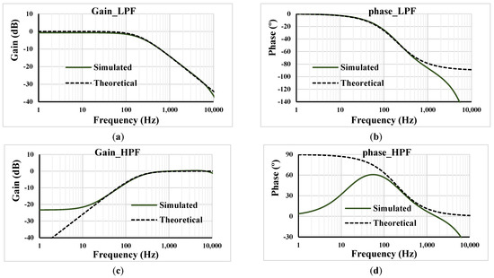 Figure 6 shows the simulated and theoretical frequency characteristics of the gain and phase of the proposed voltage-mode first-order universal filter from Figure 4 with R1 = 400 kΩ, capacitor C1 = 2 nF and setting current Iset1 = Iset2 = 0.5 µA (gm = 2.5 µS). The designed cut-off frequency of 197.4 Hz was very close to the simulated frequency of 195.6 Hz.
