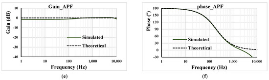 Frequency characteristics of the gain and phase: (a,b) LPF; (c,d) HPF; (e,f) APF.