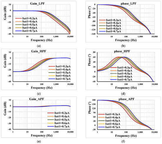 Frequency responses of the gain and phase: (a,b) LPF; (c,d) HPF; (e,f) APF with different Iset1.
