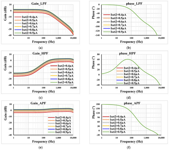 Frequency responses of the gain and phase: (a,b) LPF; (c,d) HPF; (e,f) APF with different Iset2.