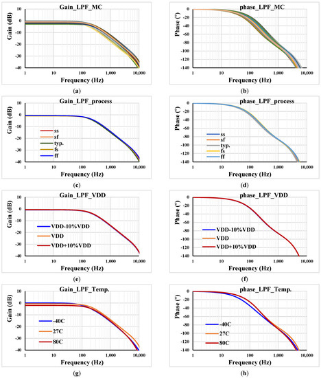 Figure 9 shows the frequency characteristics of the gain and phase of the LPF for C1 = 2 nF, R1 = 400 kΩ, and Iset1,2 = 0.5 µA. The Monte Carlo analysis, including process and mismatch variation and 200 runs, is shown in (a,b). The gain of the LPF at low frequency was in the range of −2.87 dB to −0.243 dB and the cut-off frequency was in the range of 158.48 Hz to 335.26 Hz. The slow–slow (ss), slow–fast (sf), fast–slow (fs) and fast–fast (ff) processes are shown in (c,d). Finally, (e,f) shows the voltage supply corners, VDD ± 10%VDD, and (g,h) shows the temperature corners −40 °C and 80 °C. As is evident, the curves are almost overlapped, with a slight variation in the temperature corner analysis. This is suspected to be due to the subthreshold region operation that is known to be sensitive to temperature. The deviation of the cut-off frequency can be readjusted by the setting current.