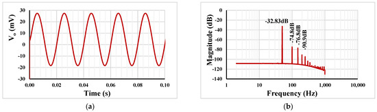 Figure 10a shows the transient response of the LPF with R1 = 400 kΩ, capacitor C1 = 2 nF, the setting current Iset1 = Iset2 = 0.5 µA, and the applied sine wave input signal 50 mVpp@ 50 Hz. The spectrum of the output signal Vo using fast Fourier transform (FFT) is shown in (b). The total harmonic distortion was calculated as −39.97 dB (1.024%).