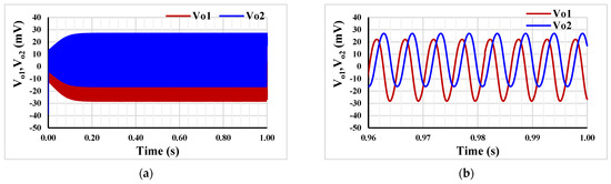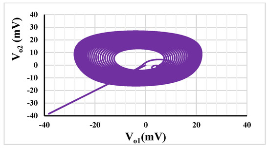 For the oscillator in Figure 5, R1 = 400 kΩ, capacitors C1 = C2 = 2 nF and setting current Iset1 = 0.5 µA were selected. To start the oscillation, R2 = 500 kΩ and Iset2 = 0.55 µA. Figure 11a,b show the running oscillation and steady state, respectively. The THD was around 3%. The outputs Vo1 and Vo2 are in quadrature with a frequency of 192 Hz. Figure 12 shows the relation between Vo1 and Vo2 that can confirm the quadrature relationship of the output signals.