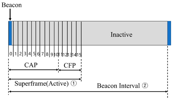 In the IEEE 802.15.4 beacon mode, the interval at which the coordinator broadcasts the beacon frame is called a superframe. It is divided into 16 slots of equal size. Superframes can be divided into active and inactive durations. Figure 1 shows the structure of a superframe.