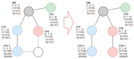 Figure 11 shows that, when the new node receives the beacon frame from CH1-1 and CH2, the configurable channels through the received beacon frame are numbers 1 and 2. In addition, because the tree level of CH2 is 1 and that of CH1-1 is 2, the node selects CH2 (with a small tree-level value) as the parent cluster head. This would then be referred to as CH1-1. Figure 12 shows an example of a new node joining CH3.