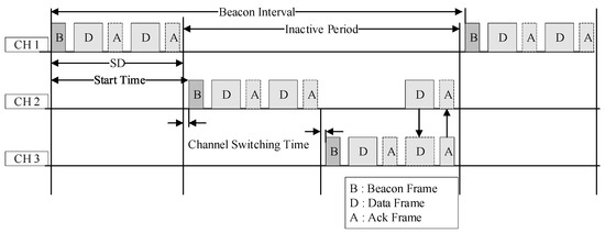 In the proposed scheme, the beacon frame is generated and broadcast by the gateway or cluster head. Moreover, a user-defined payload field contains the superframe schedule information of the current channel as well as the superframe schedule information of the other channels. Therefore, when traffic is congested in the current channel, the data frames can be transmitted using the superframe schedule information of another channel (the secondary channel).