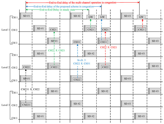 Initially, the gateway displays the SD slot it occupies and the SD slot of the one-hop neighboring node in the CH Info # field and broadcasts a beacon frame. It is assumed that three channels are used and that the number of allocatable SDs is six. It is also assumed that the maximum value of the NCM field of the gateway is set to six and that of the NCM field of the other cluster heads is set to two. In this case, the gateway preempts SD numbers 1 and 3 in advance on channel 1, SD numbers 2 and 4 on channel 2, and SD numbers 3 and 6 on channel 3 in preparation for connecting the 6 cluster heads. Figure 7 shows an example of the proposed SD selection algorithm that operates in a network using three channels.
