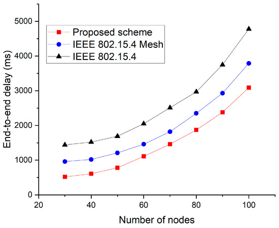 Packet loss is the ratio of packets dropped owing to interference to the total number of packets received. In this simulation, the delivery success rate of the proposed scheme was 98.19% when the packet loss was 0%, and 77.14% when the packet loss was 20%. When considering the beacon loss owing to transmission errors, a device adopting the proposed scheme loses 2.86% of the data frames. Meanwhile, the delivery success rate of the IEEE 802.15.4 standard and IEEE 802.15.4 mesh protocol was 47.13% when the packet loss was 0%. As the packet loss probability increases, the performance of the legacy protocol degrades significantly, and the difference in its performance from that of the proposed scheme increases further. This is because the IEEE 802.15.4 standard and IEEE 802.15.4 mesh protocol cannot prevent interference from other networks, and a larger interference causes more packet losses.