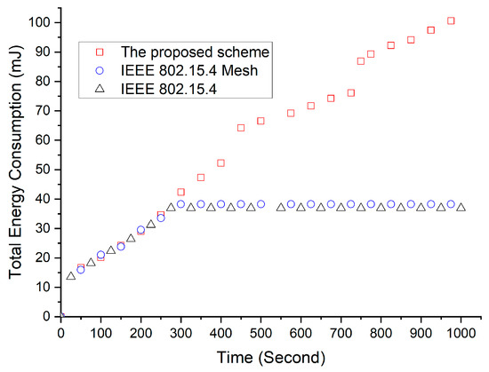 Figure 23 shows the dissipated power consumption of the device located in the overlapping region of the transmission ranges. The dissipated power consumption of the device that used the proposed scheme was equal to that of both a device that used the IEEE 802.15.4 standard and one that used the IEEE 802.15.4 Mesh protocol before data frames collide, as observed in this figure. At 253.19 s, the beacon frames first collided. Then, the devices that used the IEEE 802.15.4 standard and IEEE 802.15.4 mesh protocol performed an orphan scan after 253.19 s. In the simulation, the device that used the IEEE 802.15.4 standard and IEEE 802.15.4 mesh protocol attempted to synchronize with its cluster head. However, this device could not receive beacon frames and failed to synchronize because of beacon frame collisions. This legacy device restarted and attempted to associate with the cluster head but failed again because of beacon frame collisions. Finally, the device was switched off. Hence, the device using the legacy protocol did not consume energy after 270.58886 s.