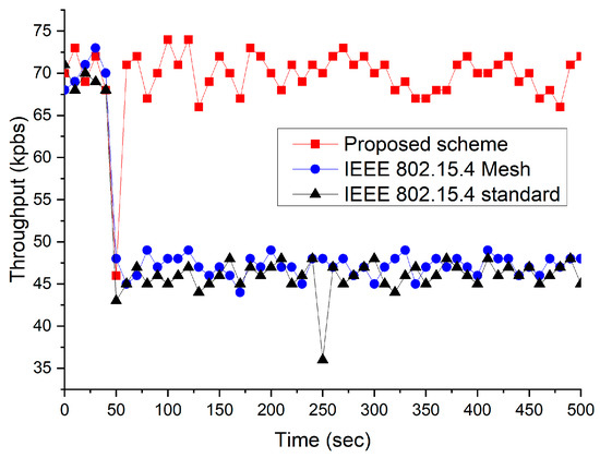 The next scenario considered a network environment with the presence of WLAN. Figure 24 and Figure 25 show the throughput of the interfered network when the traffic loads of the WLAN were 2 and 8 Mbps, respectively. In the simulation, the WLAN device was switched on for 50 s. It can be observed that the IEEE 802.15.4 standard and IEEE 802.15.4 mesh protocols were highly susceptible to the presence of the interferer. The network performance of the two protocols was degraded severely by the presence of the interferer because these do not provide an interference avoidance scheme. However, the proposed scheme could maintain the network performance, regardless of the presence of an interferer. This is because it can modify its network channel into an idle channel when it detects interference. Additionally, the proposed scheme provides a significantly faster recovery time. This is primarily because it can rapidly prevent channel interference by migrating the network channel to a predetermined idle channel.