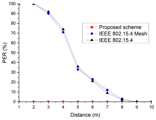 Figure 27 shows the PER of the IEEE 802.15.4 network protocols under the interference of the WLAN with a 2 MHz center frequency offset. The distance between the IEEE 802.15.4 device and WLAN device varied from 0 m to 10 m. As the distance increased, the PER of the IEEE 802.15.4 standard and IEEE 802.15.4 mesh protocols decreased. This was because the power of the WLAN was concentrated at the center frequency. However, the proposed scheme maintained a constant PER regardless of this distance because it could prevent interference by the WLAN device.