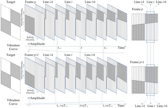 where . Within the integration time , the average offset of row i in frame p, which is affected by vibration, can be expressed as follows: