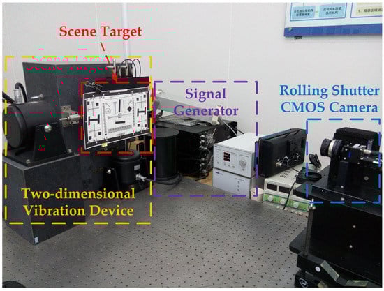The experimental equipment mainly included an optical platform, two-dimensional vibration device, signal generator, rolling-shutter CMOS camera, scene target, etc. The experimental platform is shown in Figure 3.