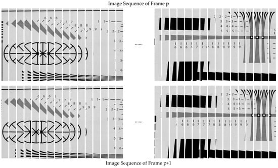 The two frames of continuously exposed images were processed by windowing, and the appropriate windowing size and windowing interval were selected. The windowing interval was the sampling frequency of the vibration detection. The two groups of windowing image sequences are shown in Figure 5. By comparing the image sequence, we can observe that there are displacements in both the horizontal and vertical directions between the two frames, indicating that they were affected by vibration, resulting in twisting and stretching. Furthermore, there are dissimilarities between the impacts on frame p and frame p + 1.