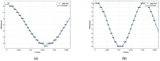 A vibration parameter detection algorithm based on rolling-shutter CMOS correlation imaging was utilized to compute the gray projection of corresponding image pairs in two sets of windowing image sequences. The relative offset array of vibration between two continuous exposure rolling-shutter CMOS correlation images was subsequently obtained. By performing Fourier fitting on the array, we can obtain the fitting curve and its corresponding parameters for vibration offset. The offset fitting curves for the horizontal and vertical directions are depicted in Figure 6.