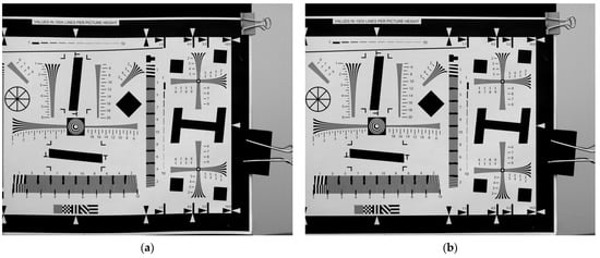 Since the motion is relative, the target motion was used in the experiment to simulate camera vibration. A two-dimensional vibration device was used to add vibration excitation to the target in both horizontal and vertical directions. The equivalent vibration parameters on the focal plane after conversion are shown in Table 1. The direction of the camera rolling shutter was horizontal. First, we selected the ISO 12233 camera resolution chart as the scene target. The rolling-shutter CMOS camera has a row time of 20.52 μs, with an exposure time that is 20 times the row time (410.4 μs). The correlation images captured in two consecutive frames are presented in Figure 4. It can be seen from Figure 4a,b that under the influence of vibration, the straight line in the horizontal direction distorted, while the straight line in the vertical direction shifted in the transversal direction. There were also some differences in vibration effects between frame p and frame p + 1.