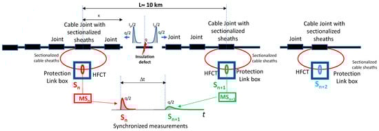 For today’s insulated transmission cables with lengths of hundreds of km, only HVDC cable systems are used [,]. One disadvantage of these cable systems, unlike HVAC cables, is that they do not have link boxes to place HFCT-type sensors every 500 m or 700 m, while in HVDC cables, a longer distance of around 10 km is required, as shown in Figure 1. Consequently, the sensitivity of HFCT sensors used for HVDC must be higher than that required for HVAC cable systems.
