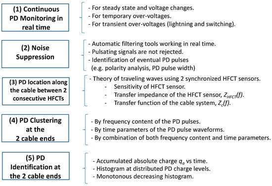 The detection of insulation defects close to the HVDC substation is more difficult because it requires power clustering tools (4) to discriminate different PD sources and pulsating noise. Pulsating noise due to power electronics such as thyristors or IGBTs of rectifiers and converters, especially disturbing close to cable ends, must be separated from PD pulse signals using clustering tools (4). Clustering tools by frequency analysis of each pulse or waveform time parameters [,] are useful to separate PD sources from pulsating noise signals. PD recognition tools (5) [,,,,,,] based on PD histograms, accumulated charge vs. time or other PD patterns are used to discriminate different insulation defects: corona, surface PD, floating, etc.
