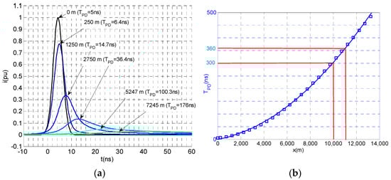 (a) PD pulse distortion traveling along an HVDC cable system. (b) Growth of the PD time, TPD, traveling along an HVDC cable system with an initial TPD = 5 ns.