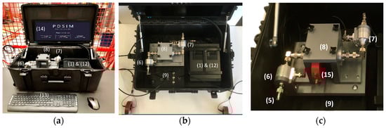 Practical implementation of the calibration setup for qualification of PD analysers: (a) front view; (b) top view; (c) detail view. (1) & (12) AWG & PC, (13) computer keyboard, (14) built-in screen, (5) load resistance for impedance matching, (6) and (7) the two improved HFCT sensors, (8) open test cell, (9) digital recorder, (15) HFCT sensor under characterization.